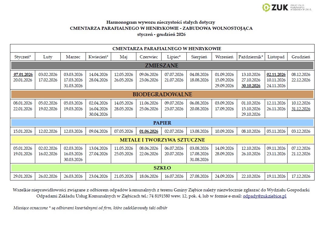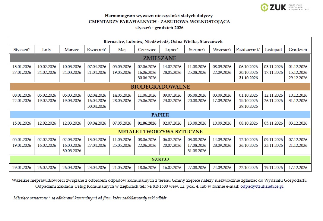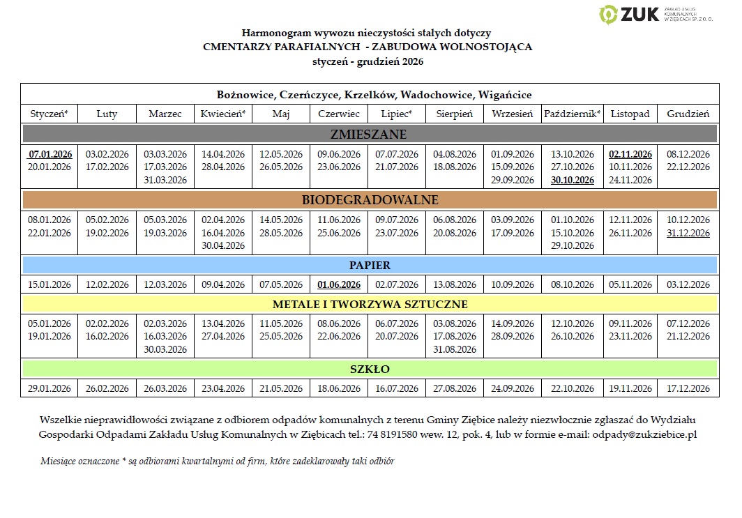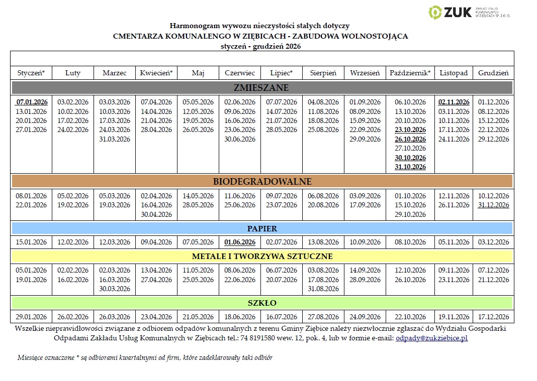 Harmonogram wywozu nieczystości stałych na 2026 rok